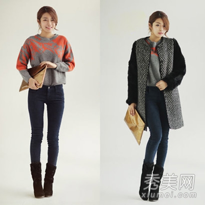 大衣的穿搭方式很多,气质、身材不同的女孩们,当然适应的风格搭配也不一样呢。这件呢子皮草拼接大衣外套,袖子是黑色皮草拼接而成的,很大气也很保暖,里面穿搭简约风的灰色毛衣,下身配低腰牛仔和绒面靴,就挺漂亮的。