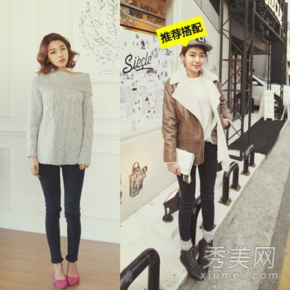 如何打造可爱、休闲的冬季居家装扮呢?一件斜领设计的灰色麻花图案毛衫,配上小脚牛仔裤,就很简单、养眼呢。外出的话,一件巧克力色皮夹克,再加上这样的内搭就很OK哦!