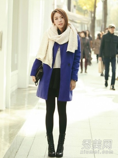 穿大衣,学韩国女生这样配上围脖或者是围巾是最显气质的。一件钴蓝色的毛呢大衣,选用黑白灰中任意一种色款的毛衣做内搭都很美,下身短裙配裤袜、系带高跟靴,就更加完美了。
