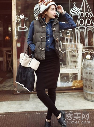 深灰色羽绒服马甲外套,配搭牛仔衬衣、包臀裙、打底裤袜、铆钉平底鞋,整体搭配比较的贴身,很显身材的呢。而且配件的潮搭,也非常突显个性美。下身黑色系裙装与裤袜的巧搭,达到了显瘦高的效果。