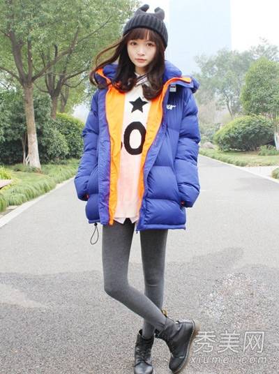黑色兔耳朵毛线帽,增加你的乖萌可爱气质,冬季卖萌必选的潮品之一哦!面包款加厚钴蓝色羽绒外套,内搭毛衣衬衫的穿法,也很层次感,下身灰色裤袜与马丁靴的搭配,则起到了拉伸身材线条的作用,视觉显高效果好。
